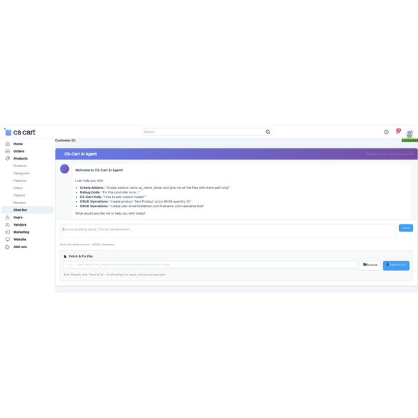Transform how you build, manage, and grow your CS-Cart store with our powerful AI Agent & Chatbot — an intelligent assistant that understands your natural language and performs real tasks for you. No coding needed!