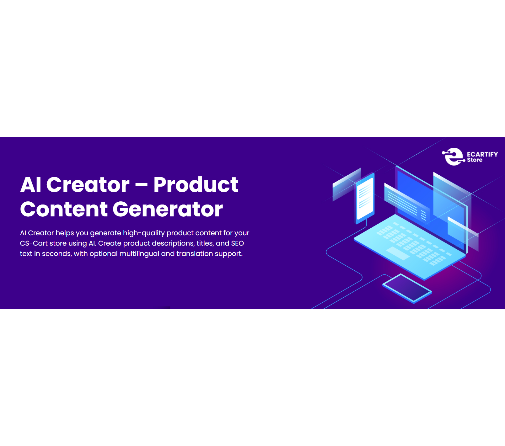 Stop spending hours writing product descriptions manually. Let AI Creator by Ecartify handle content generation while you focus on growing your CS-Cart business. Generate professional, SEO-optimized content in seconds with the most powerful AI content generator for CS-Cart.