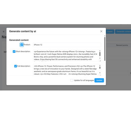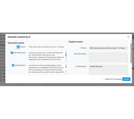 Flexible Content Templates: Choose from pre-built templates or create custom prompts for specific product types. Generate short descriptions, full descriptions, bullet points, or complete product pages with AI customization.