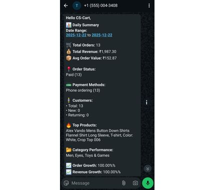 Eliminate manual reporting with intelligent automation. This CS-Cart addon by Ecartify delivers comprehensive business insights directly to vendor WhatsApp numbers on your custom schedule.