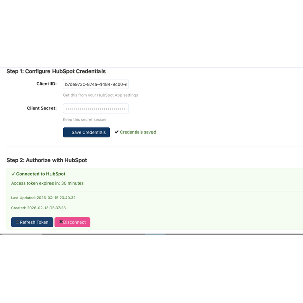 The HubSpot Vendor Connector lets you connect your personal HubSpot account and automatically sync your products, customers, and orders from the marketplace. Build a complete customer database, automate marketing campaigns, and track your business growth in HubSpot's professional CRM platform. With real-time synchronization, your data is always current. Use marketing automation to drive repeat sales, segment customers for targeted campaigns, and see your sales pipeline organized by order status. Secure OAuth 2.0 authentication ensures your personal data is protected and completely under your control. Perfect for vendors looking to grow their marketplace business with professional business tools. Set up in minutes and start growing today.