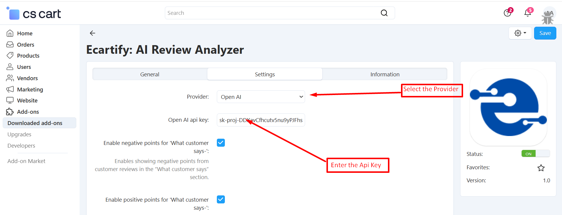 Your AI Review Analyzer Add-on is now ready to help you make smarter use of customer feedback in your CS-Cart store. It automatically analyzes customer reviews to extract meaningful positive and negative insights, detect fake or low-quality reviews, and generate structured reports that are easy to understand and act on. By keeping your review section clean, transparent, and informative, this add-on helps build customer trust, improves product credibility, and supports better purchasing decisions — ultimately leading to higher engagement and increased conversions.