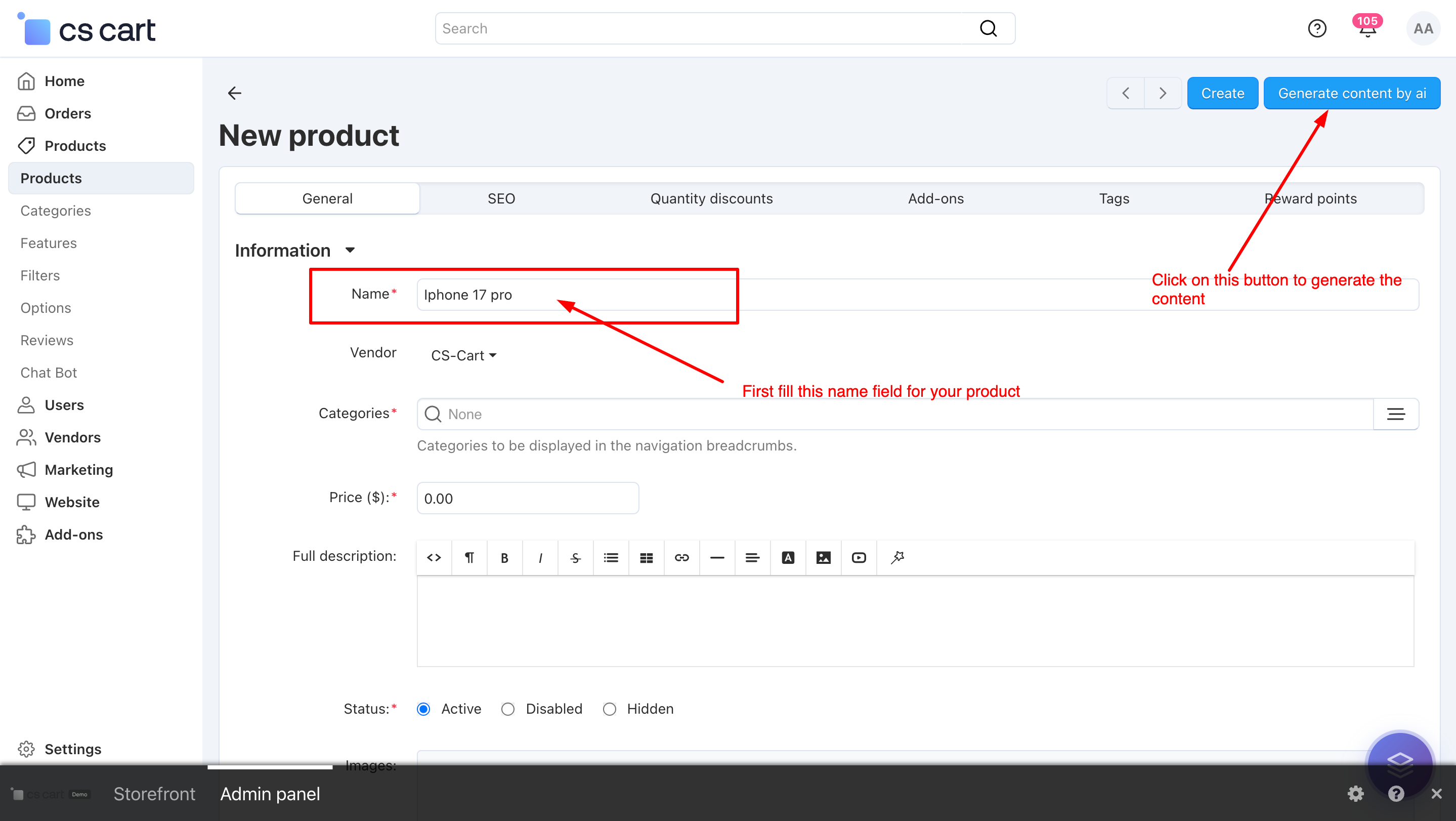 AI Creator helps you instantly generate high-quality, SEO-friendly product content for new and existing products in your CS-Cart store using multiple AI engines. It also allows you to translate review and chat messages from one language to another, giving you full control over what gets updated while saving time and improving conversions and customer engagement.