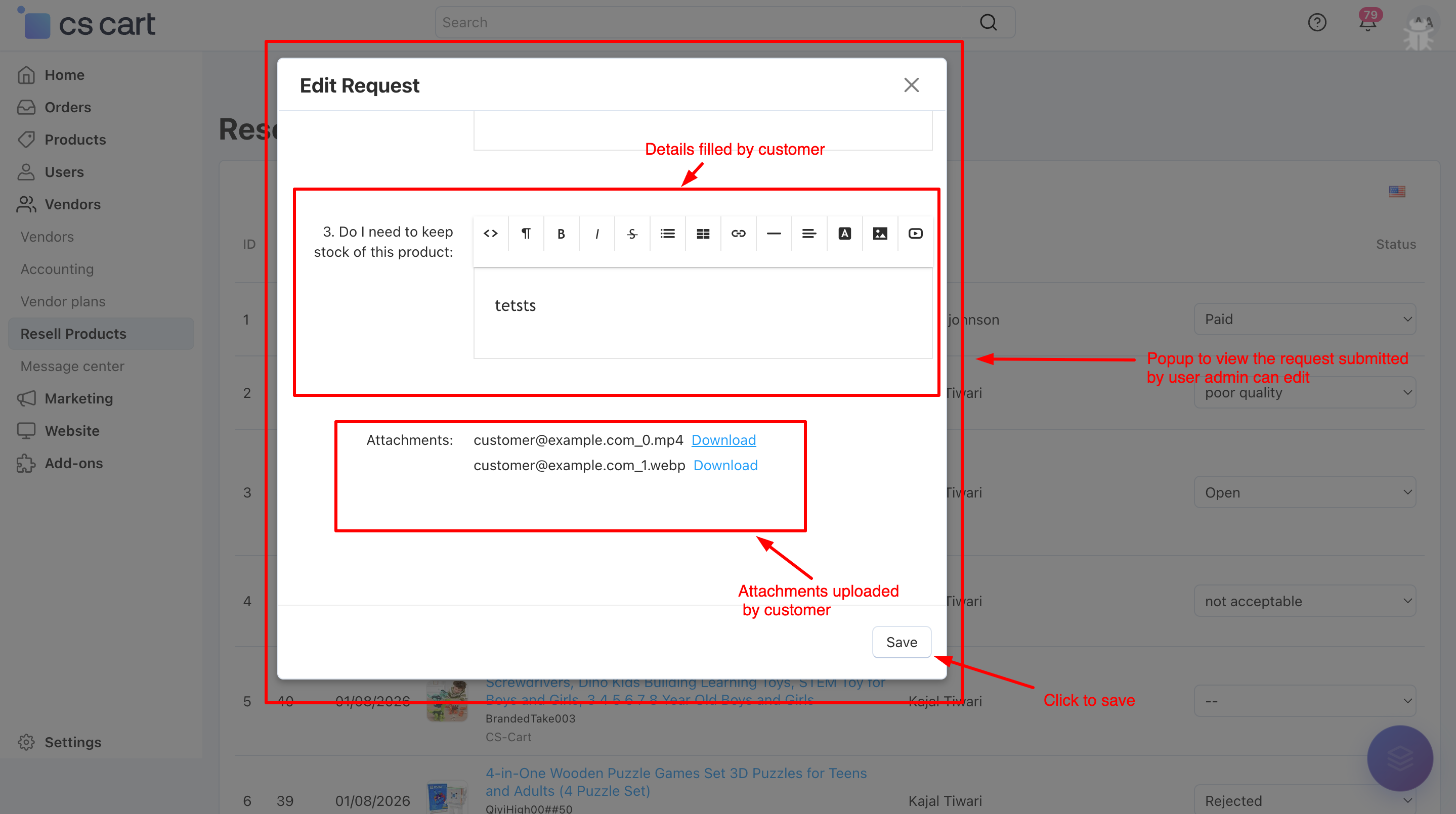 Product Resell Addon helps you easily manage customer resell requests and streamline the buyback process in your CS-Cart store. It allows customers to resell purchased products through a simple frontend form, while admins can review requests, manage statuses, assign vendors, and clone products with full control—saving time, improving transparency, and boosting marketplace engagement.