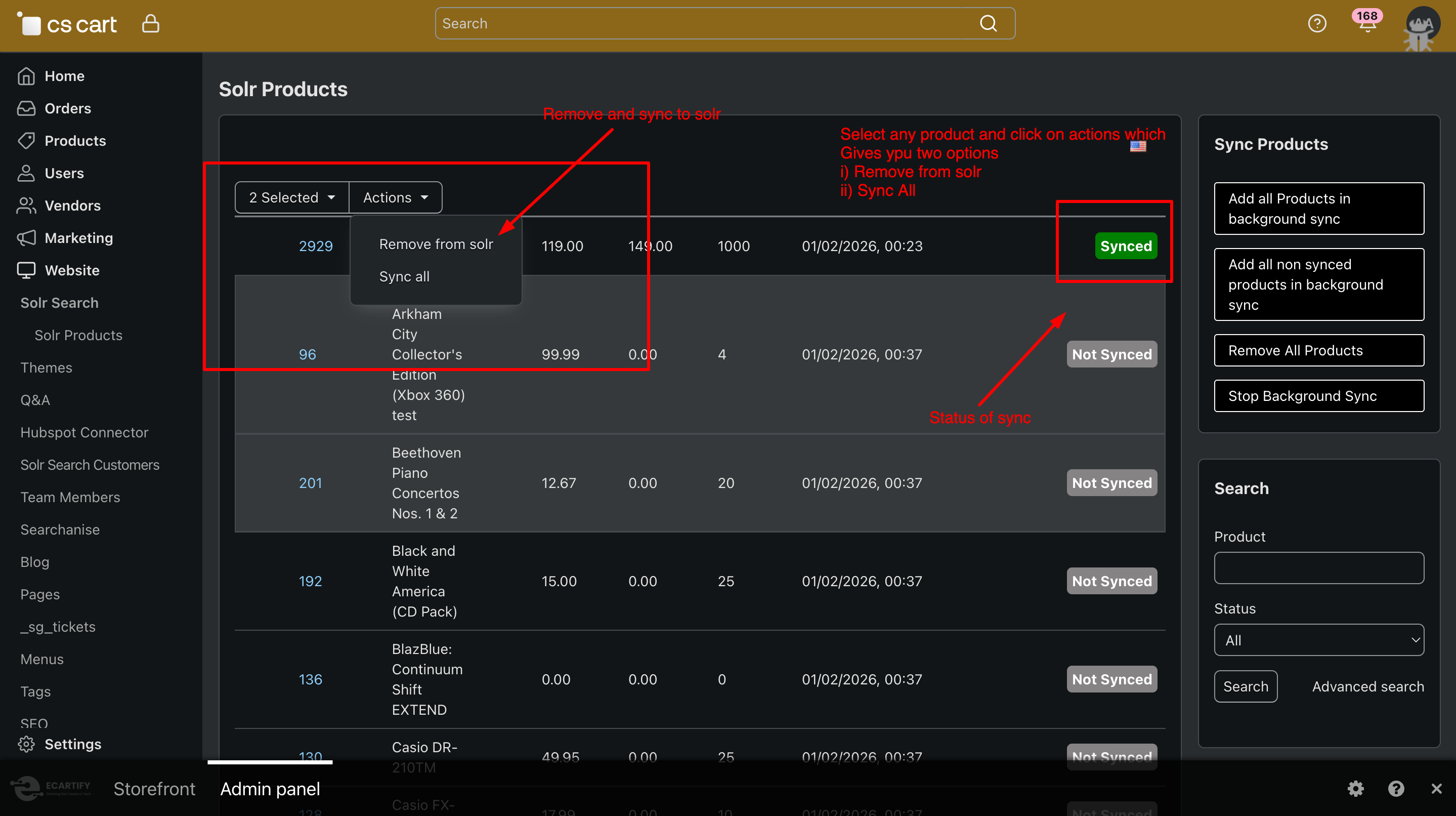 This section of the dashboard shows detailed product sync information, including when syncing was last stopped and how many products have been synced. It also provides control options to stop syncing or remove all products from Solr whenever needed.